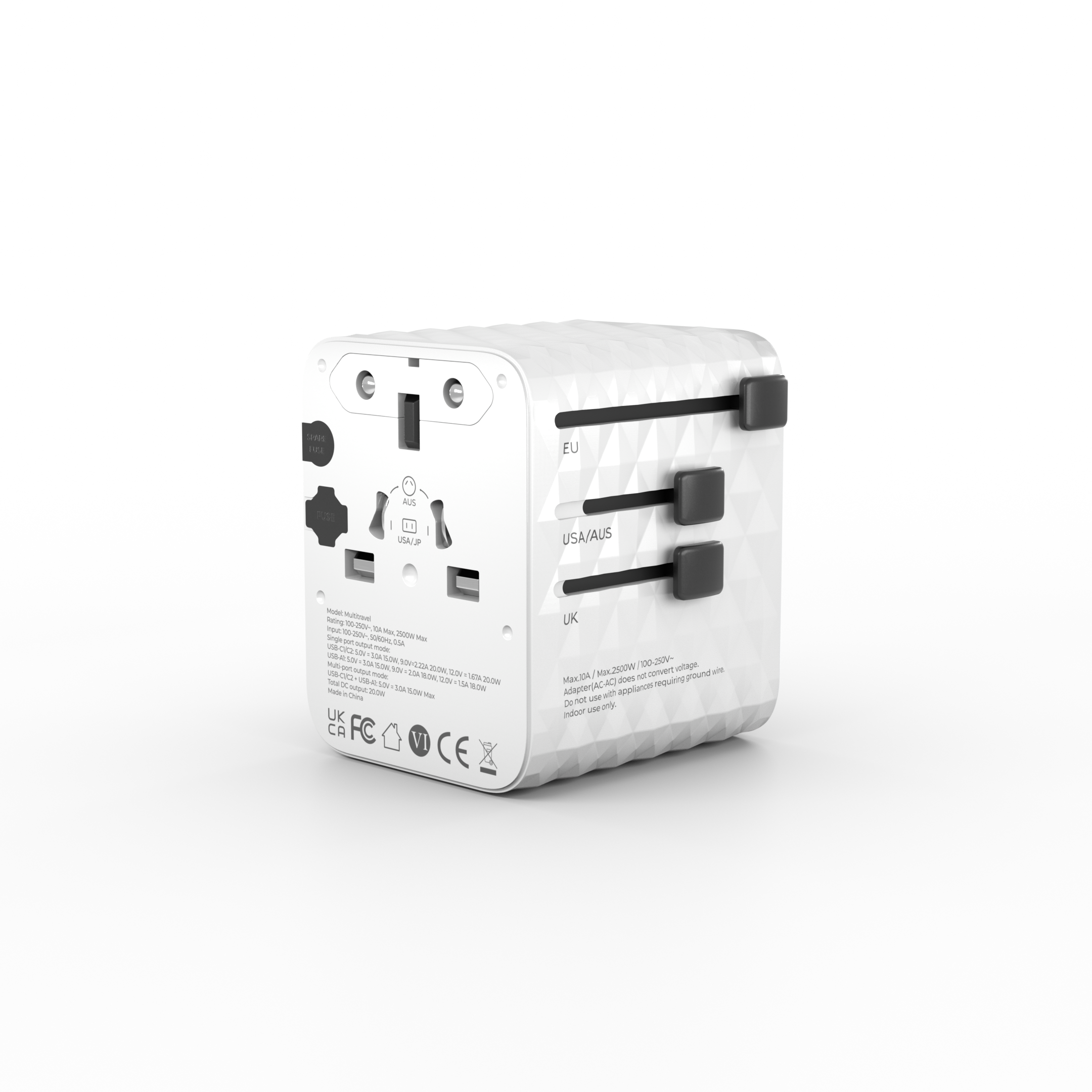 MultiTravel, dünyanın farklı ülkelerinde güvenle kullanabileceğiniz çok yönlü bir seyahat adaptörü ve USB şarj çözümüdür. Tek bir adaptör ile birden fazla priz tipini destekler ve aynı anda hem elektronik cihazlarınızı çalıştırmanıza hem de USB üzerinden şarj etmenize olanak tanır. ABD, Avrupa, İngiltere ve Avustralya priz tiplerini desteklediği için dünyanın birçok ülkesinde kullanılabilir.
